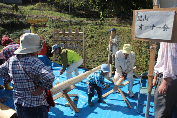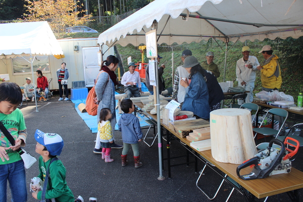 里山オーナー会の会場で男の子がのこぎりで木材を切っている様子を見ている大人たちの写真 拡大画像 (JPEG: 234.4KB)