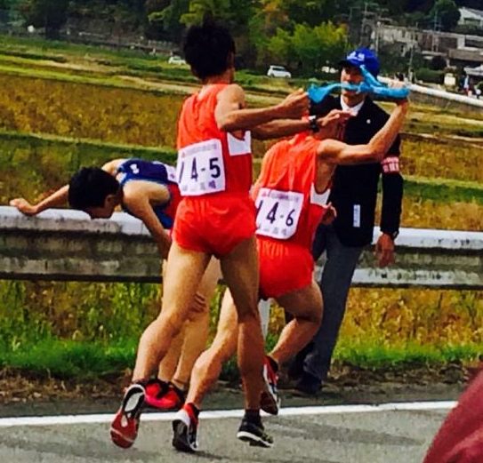 篠山鳳鳴高等学校の生徒が次のランナーにタスキを渡す様子を後ろから写した写真 拡大画像 (PNG: 462.2KB)