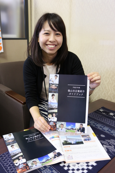 机には篠山市企業紹介ガイドブックが広げられ、女性がガイドブックを持って笑顔で紹介している写真 拡大画像 (JPEG: 137.9KB)