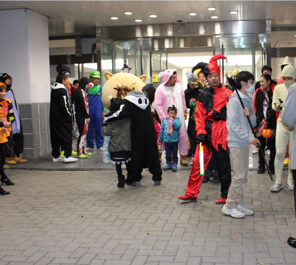 玄関前に、ハロウィン衣装の方が集まっている写真 拡大画像 (PNG: 531.0KB)