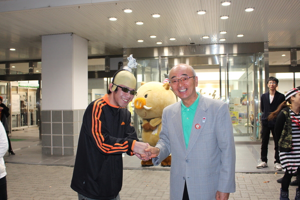 カツラにジャージの男性が市長と握手の写真 拡大画像 (JPEG: 157.2KB)