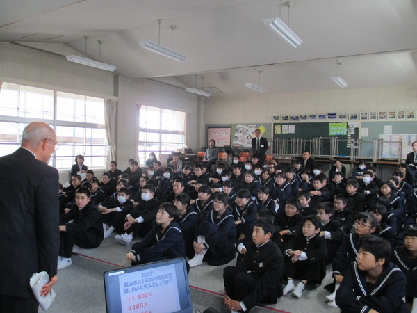 教室の中で生徒たちが体育座りをして市長の話に耳を傾けている写真真 拡大画像 (JPEG: 73.9KB)
