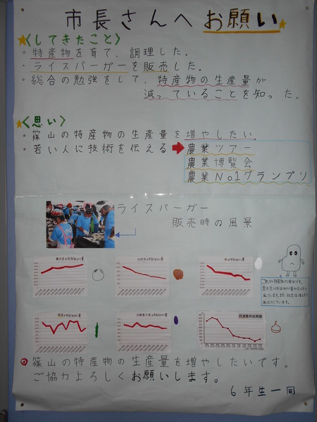 市長さんへのお願いと題して篠山市の特産物の生産量を増やしたい生徒たちの思いがグラフやイラストを使って上手く描かれている模造紙の写真 拡大画像 (JPEG: 74.2KB)