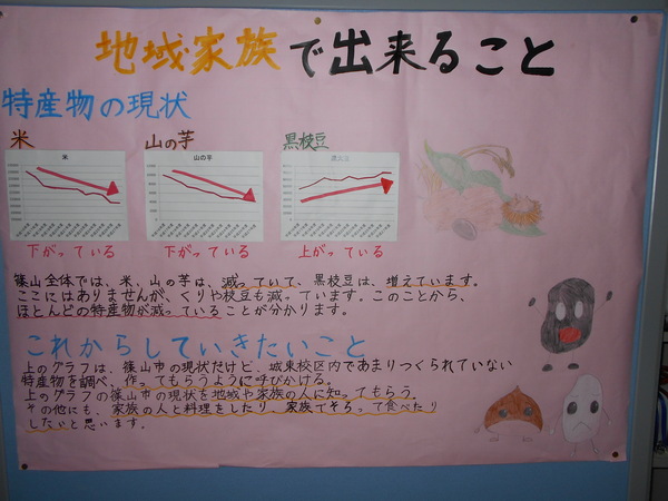 生徒が調べた地域家族で出来ることと題して篠山市の特産物の生産量についての提案がイラストやグラフを使って書かれている模造紙の写真 拡大画像 (JPEG: 81.0KB)