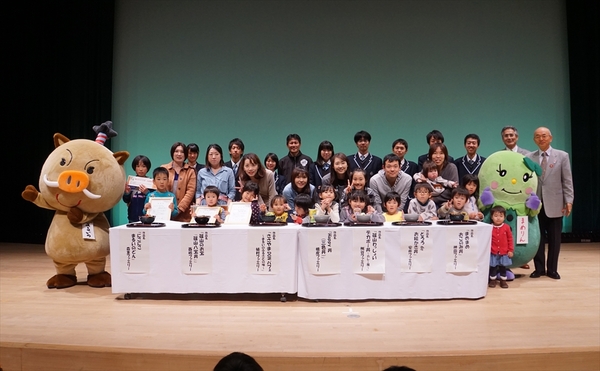 イメージキャラクターと西嶋 大恵くんが篠山八宝丼を持ち、西嶋 咲子さんが賞状を持って記念写真 拡大画像 (JPEG: 186.1KB)