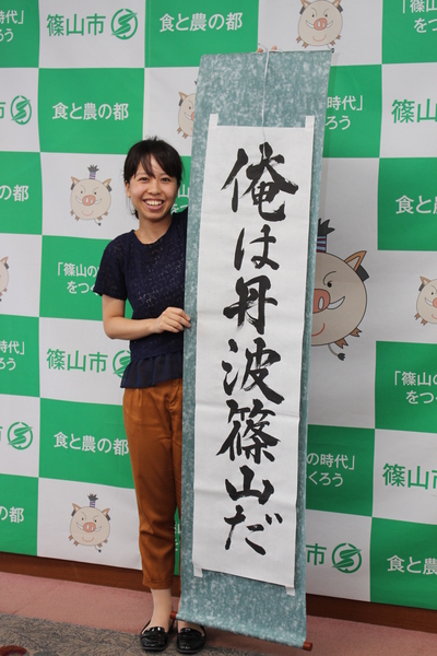 「俺は丹波篠山だ」と習字で書かれた大きな掛軸を女性が持っている写真 拡大画像 (JPEG: 148.9KB)