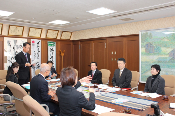 市長室で男性が立って資料を読んでいて、市長の右横の女性が手話で前に座っている3人に話をしている写真 拡大画像 (JPEG: 163.7KB)