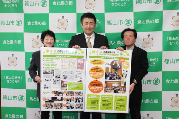 条例に定めている「手話施策推進委員会」を7月から3回開催し、委員のみなさんに手話施策推進方針(案)をまとめていただき、12月17日、手話施策推進委員会小林委員長(兵庫県聴覚障害者協会副理事長)、委員の大内さん、細見さん(丹波ろうあ協会)から報告を受けました。
