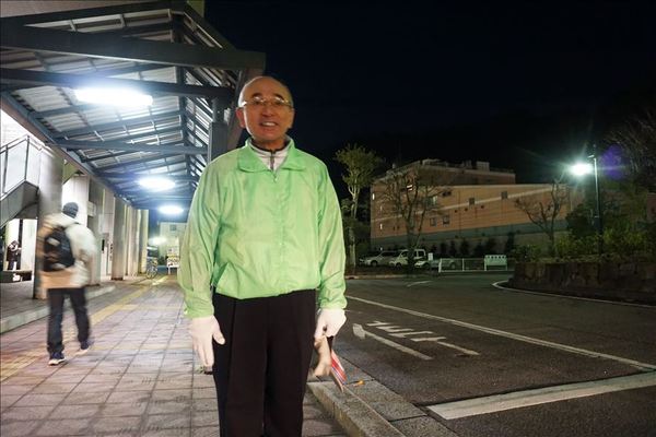 市長が薄緑のパーカーを着て篠山口駅でのあいさつをしている写真 拡大画像 (JPEG: 41.1KB)