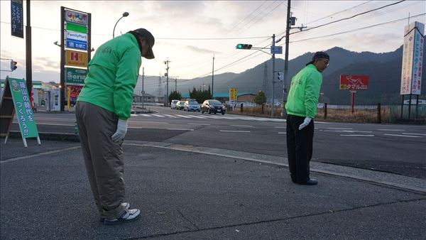 市長と男性が交差点で道路に向かいあいさつをしてお辞儀をしている写真 拡大画像 (JPEG: 39.4KB)