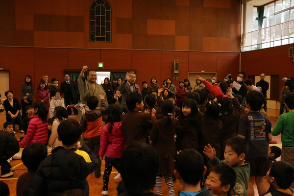 豊ノ島関の周りに集まる、沢山の小学生と片手を上げじゃんけんをしている写真 拡大画像 (JPEG: 148.1KB)