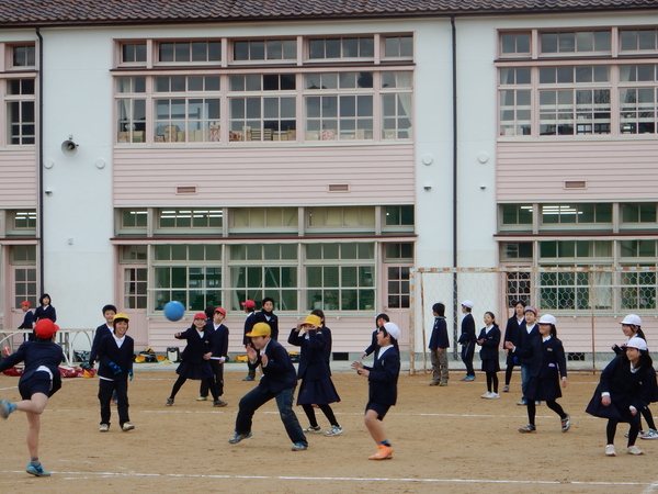 篠山小学校の校庭で、ボールを使って元気よく遊ぶ小学生の写真 拡大画像 (JPEG: 161.1KB)