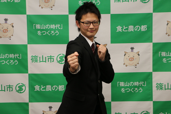篠山市の文字が書かれた前で森本くんがカメラに向かってガッツポーズをとっている写真 拡大画像 (JPEG: 115.0KB)