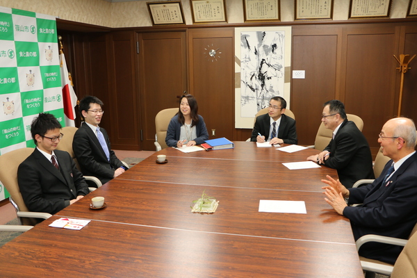 市長室の大きな円卓に表敬訪問に訪れた森本くんと顧問の福田先生が話をしているのを市長他職員3名も加わり笑顔で話しを聞いている写真 拡大画像 (JPEG: 156.2KB)