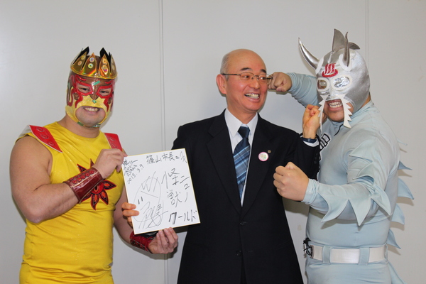 市長がニューワールドの顔にアッパーカットをしようとしており、ニューワールドは両手で拳を握ってポースをとり、タコヤキ―ダーはサインした色紙を持って写っている写真 拡大画像 (JPEG: 115.0KB)