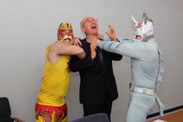 市長がニューワールドに首を絞められ、タコヤキ―ダーから腕も掴まれて技をかけられており、市長が叫んでいるようなふりをしている様子の写真 拡大画像 (JPEG: 98.6KB)