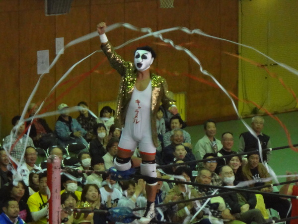 大阪らしく「えべっさん」「くいしんぼう仮面」「キャラメルボーイ」「怪獣ニューワールド」など名前と格好からしてユニークなレスラーが多く、楽しさもいっぱいでした。