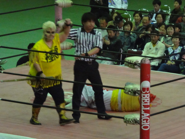 リンクの上で黄色い極悪と書かれたティーシャツを着たダンプ松本さん右手を上げ、審判が勝利のジャッジをしており、対戦相手がリンクに倒れている様子の写真 拡大画像 (JPEG: 97.5KB)