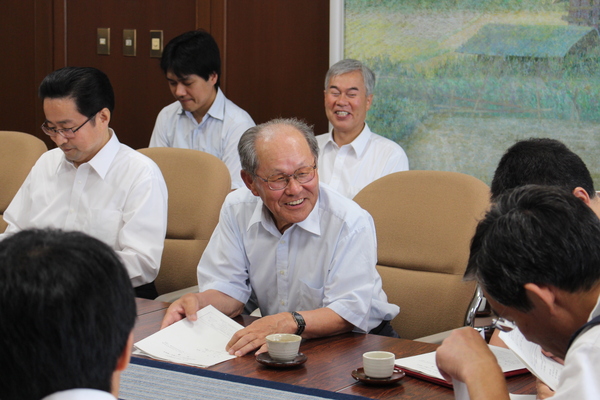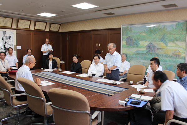 向かいに座る市長を前に、立っているご年配の男性とその周りに座っている関係者の男女の写真 拡大画像 (JPEG: 164.9KB)