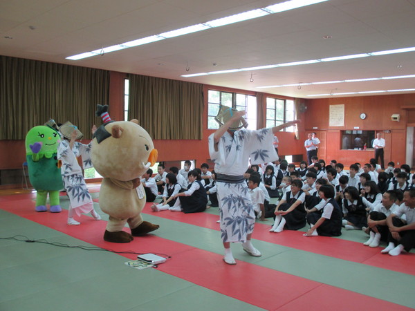 前列で浴衣を着た女性と男性とまるいの、まめりんの着ぐるみが踊っている姿を制服姿の生徒達が座って笑顔でみている写真 拡大画像 (JPEG: 73.9KB)
