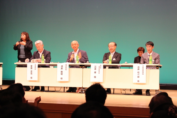 パネリストで参加された男性4名の方々が座っており、マイクを持ち市長が話をしている。その話の内容を手話で示している女性の方の写真 拡大画像 (JPEG: 118.2KB)