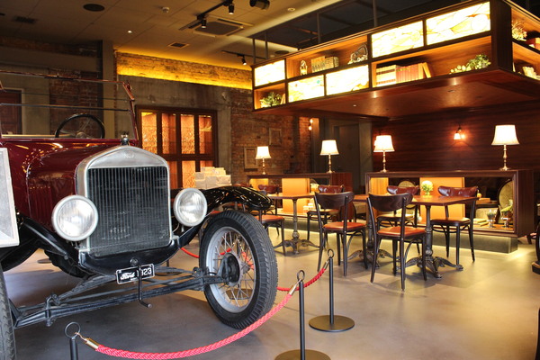 テーブルや椅子の前に赤いクラシックカーが展示されている写真 拡大画像 (JPEG: 98.6KB)