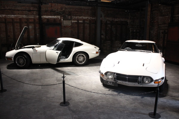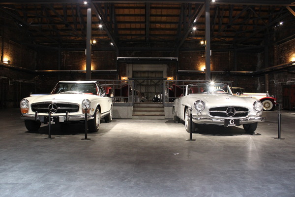 建物の中に白のクラシックカーが二台、展示されていて、一台はドアとボンネットが開いている写真 拡大画像 (JPEG: 60.9KB)