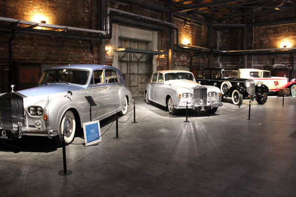 灰色の床の建物の中でシルバーや黒の4台のクラシックカーが展示されている写真 拡大画像 (JPEG: 80.7KB)