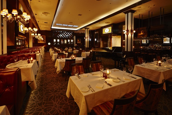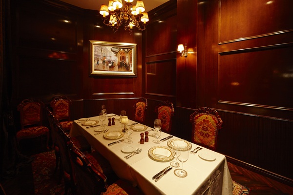 照明の落ちたレストランの中でたくさんのテーブルの上に蝋燭やお皿、フォーク、グラスなどがセッティングされている写真 拡大画像 (JPEG: 97.8KB)