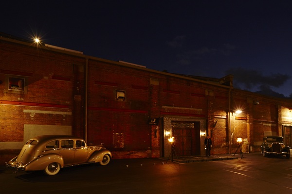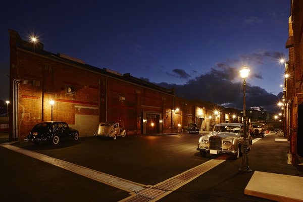 街灯が光る夜に茶色い建物の前に5台のクラシックカーが展示されている写真 拡大画像 (JPEG: 66.7KB)