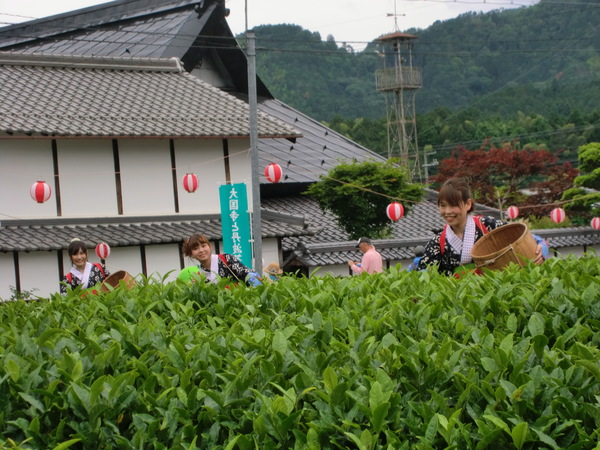 茶摘み娘の衣装を着た女性3人が茶畑に入って茶摘みをしている様子の写真 拡大画像 (JPEG: 127.5KB)