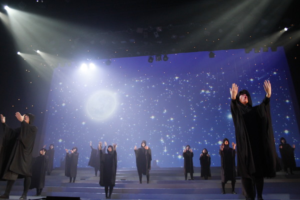 スクリーンにブルーの星をバックに、黒い衣装を着た方が劇をしている写真 拡大画像 (JPEG: 53.3KB)