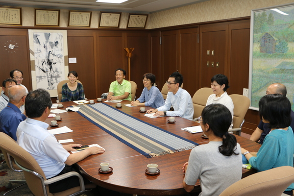 市長室の席に避難者の方々が座り笑顔で話をしていて市長はカメラに向かい笑顔で写っている写真 拡大画像 (JPEG: 168.6KB)