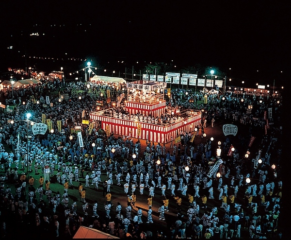 夜のお祭りで紅白幕の舞台に提灯が照らされ沢山の人が踊っている写真 拡大画像 (JPEG: 213.8KB)