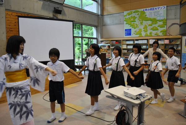 子供達が浴衣を着た女性に踊りを教えてもらっている写真 拡大画像 (JPEG: 95.3KB)
