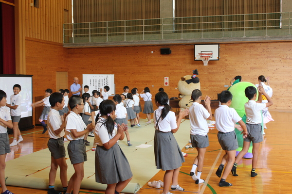 マスコット人形と踊りを踊られる方が市長と前に立ち子供達にお話ししている写真 拡大画像 (JPEG: 94.3KB)