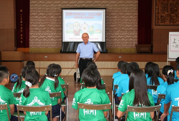 市長が小学校に訪問し子供達にお話ししている写真 拡大画像 (JPEG: 59.6KB)