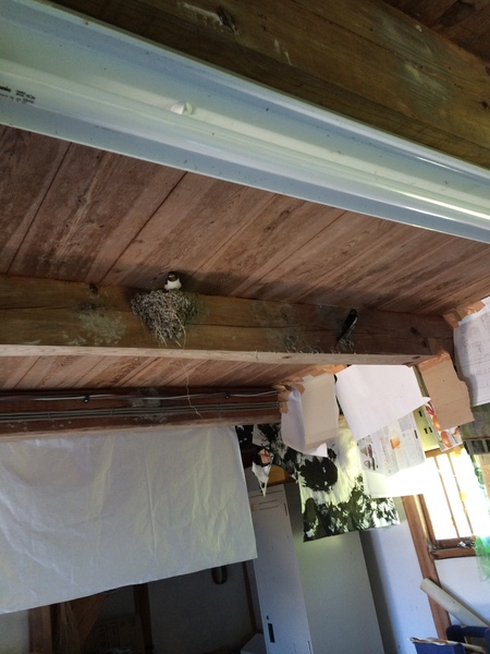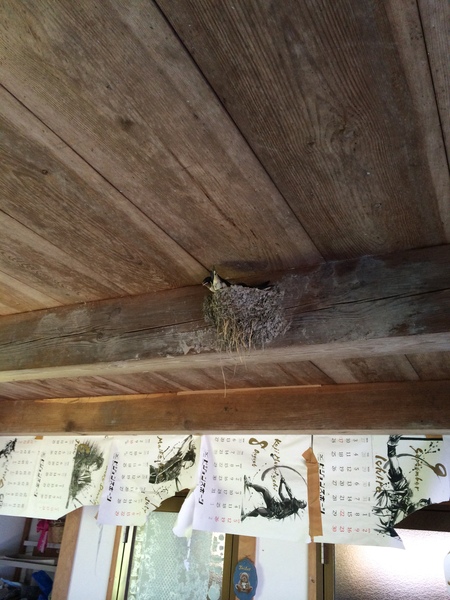 天井の梁に燕の巣があり、そこから一匹燕が顔をだしていて、その奥の梁にも燕が止まっている写真 拡大画像 (JPEG: 102.3KB)