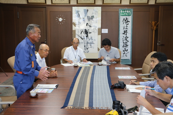 消防団員が立って話をされていて、テーブルにカメラを置いてメモを取っている方の写真 拡大画像 (JPEG: 151.7KB)