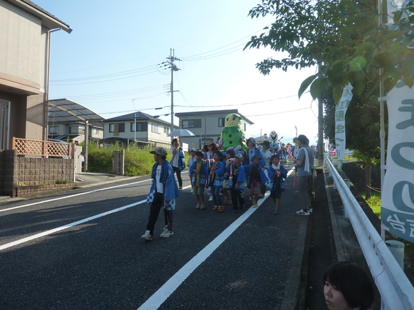まめりんの神輿を担いだ子供らが沿道を歩いている写真 拡大画像 (JPEG: 219.0KB)