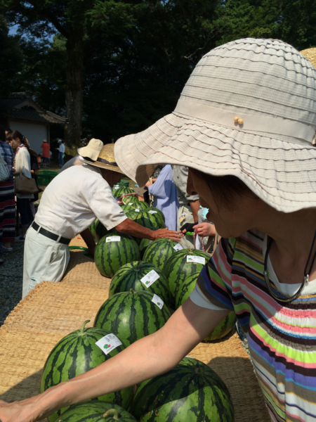 ゴザの上に沢山のスイカが並べられており、帽子を被った方々がスイカを触っている写真 拡大画像 (PNG: 505.1KB)