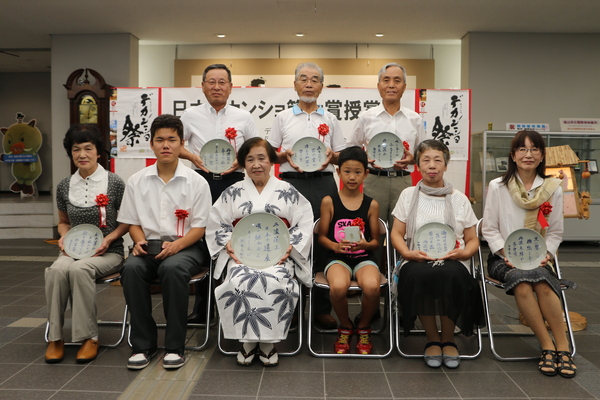 歌詞の書かれた皿やコーヒーカップを持った9名の受賞者たちの集合写真 拡大画像 (JPEG: 160.6KB)