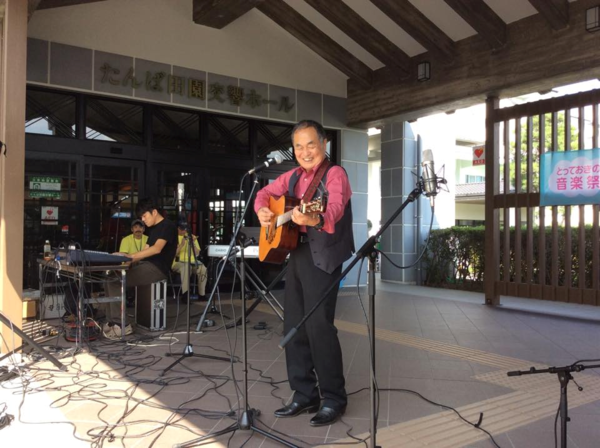たんば田園交響ホールの外で男性がスタンドマイクの前に立ちギターを演奏している写真 拡大画像 (PNG: 416.1KB)
