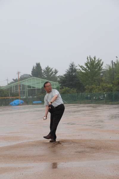 始球式で谷議員に投げてもらい、私がバッターとして立ちました。