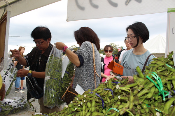 黒豆の枝豆を沢山の方が並んで購入されてる写真 拡大画像 (JPEG: 171.6KB)