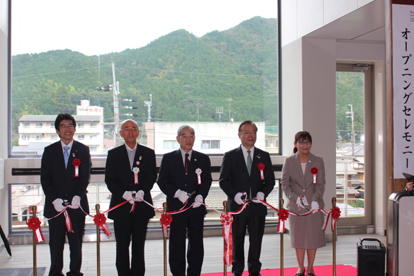 市長と3名のスーツを着た男性と女性が1名並んでいて、ハサミを持って、テープカットをしている写真 拡大画像 (JPEG: 148.7KB)