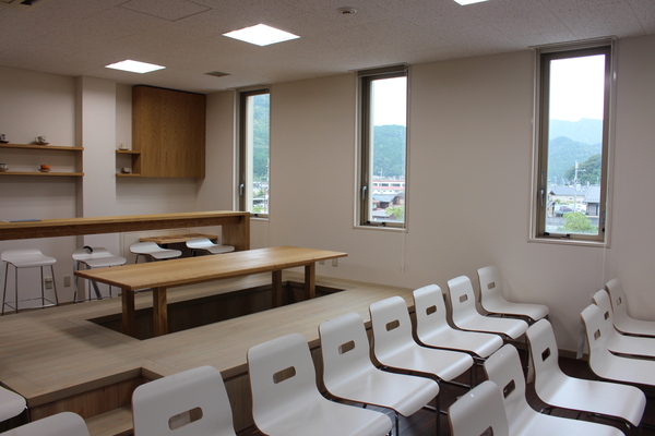 手前には15脚ほどの椅子が置いてあり、奥には掘りごたつ式の木のテーブルが置かれてある写真 拡大画像 (JPEG: 112.1KB)