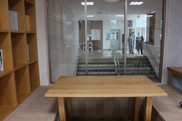 手前には木のテーブルがあり、その後ろに透明の窓ガラスがあって、奥にいる人たちや階段が見えている写真 拡大画像 (JPEG: 111.5KB)