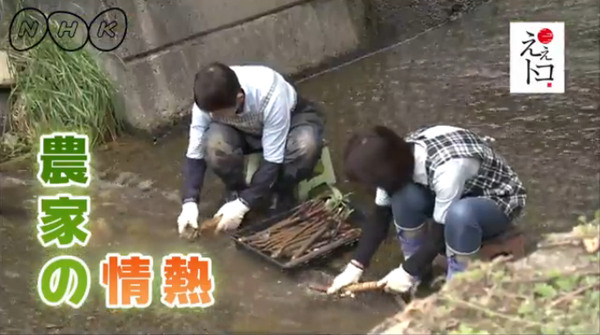 エプロン姿に長靴をはいた2名が手袋をして川の水でごぼうを洗っている(NHKええトコ 農家の情熱)の写真 拡大画像 (PNG: 306.8KB)