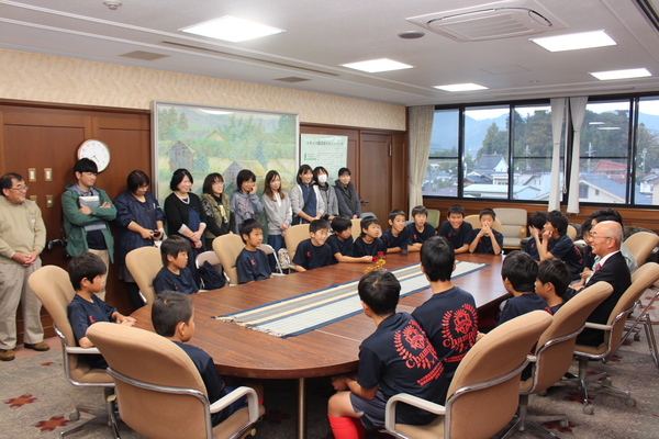 20名ほどのサッカークラブの少年たちが市長と一緒に丸いテーブルの周りに座って話をし保護者の方が立って聞いている写真 拡大画像 (JPEG: 182.2KB)